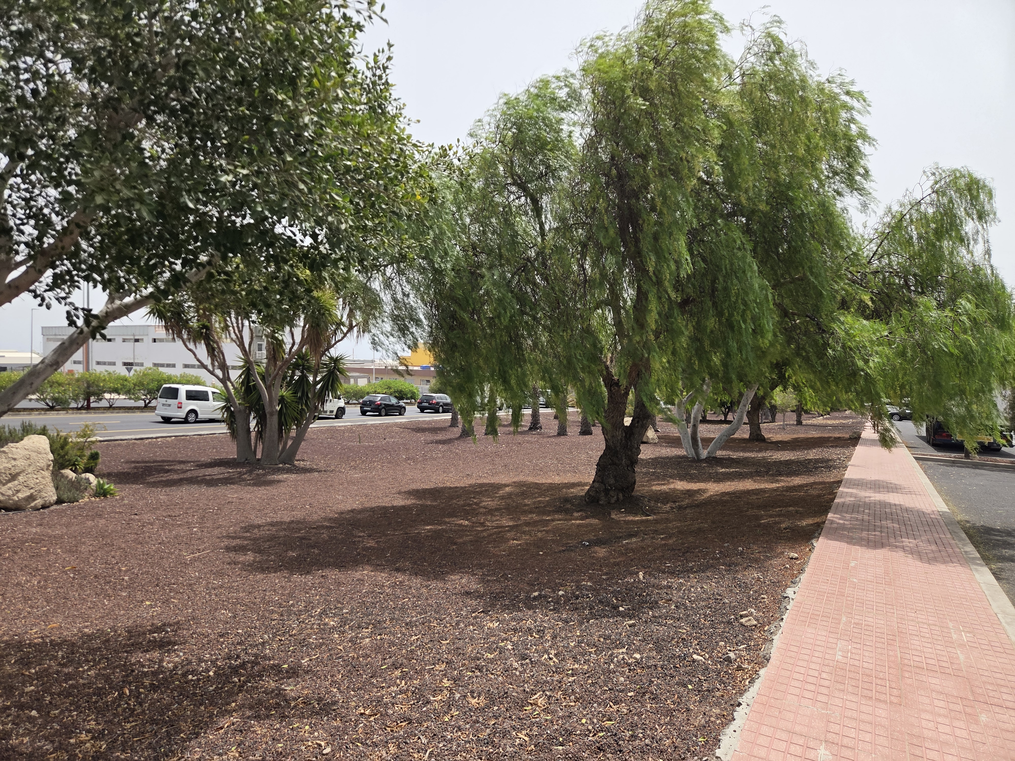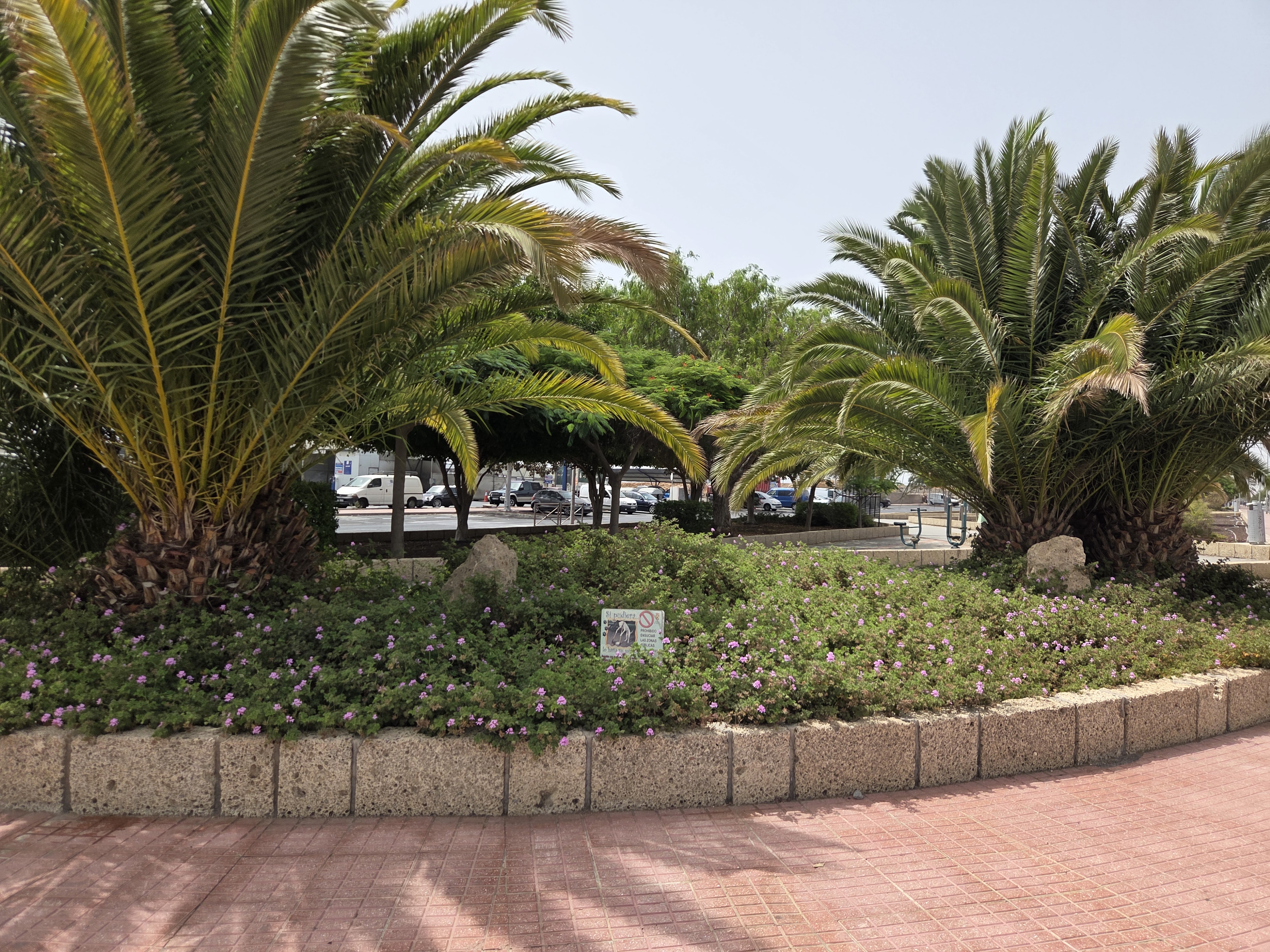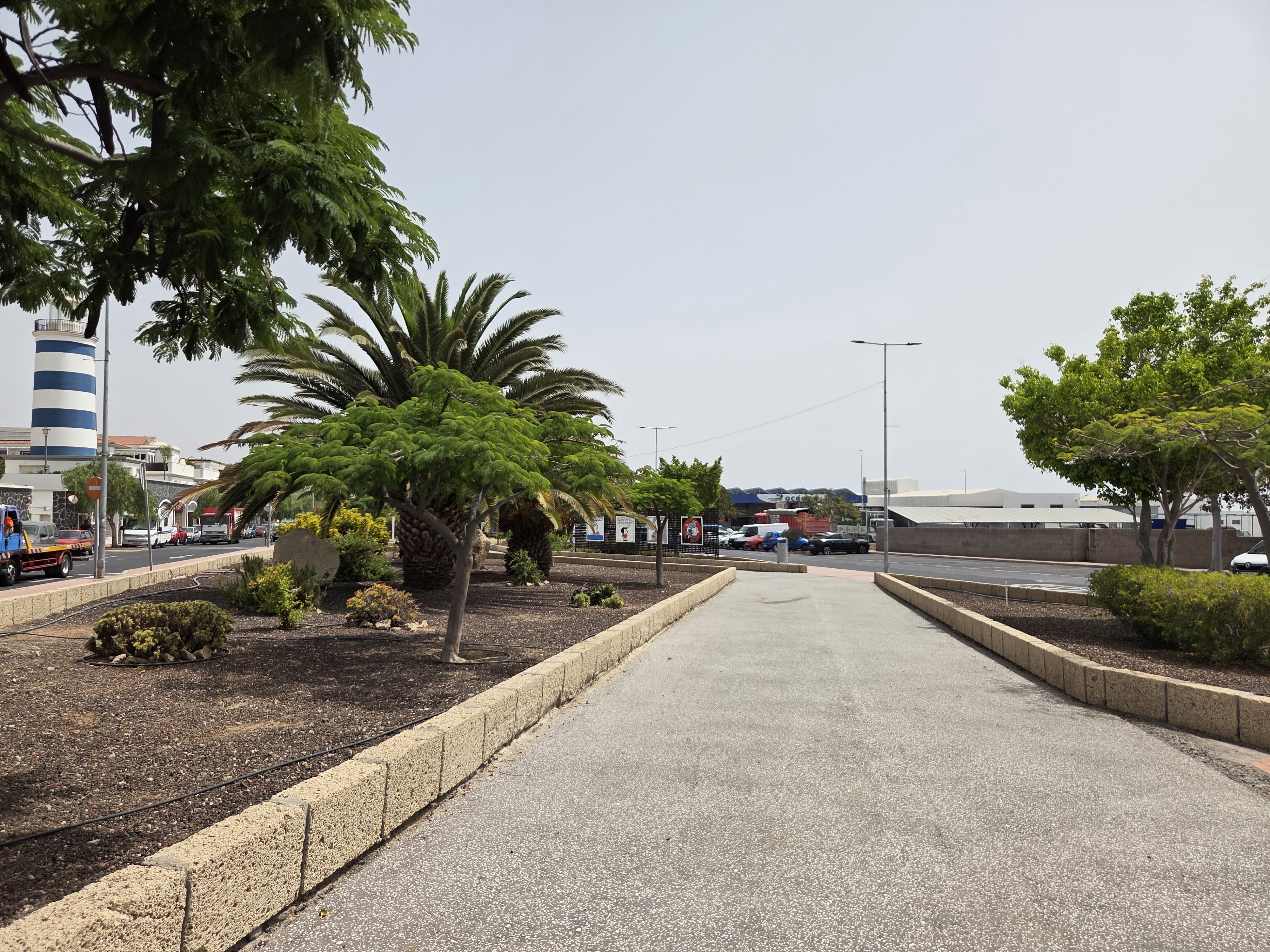 La Chafira greets visitors with broad sidewalks and landscaped public areas. The mix of volcanic gravel, palms, and flowering bushes creates a surprisingly green setting for an industrial-commercial district. These zones make it easy to walk from one store to another under the shade of tropical vegetation.