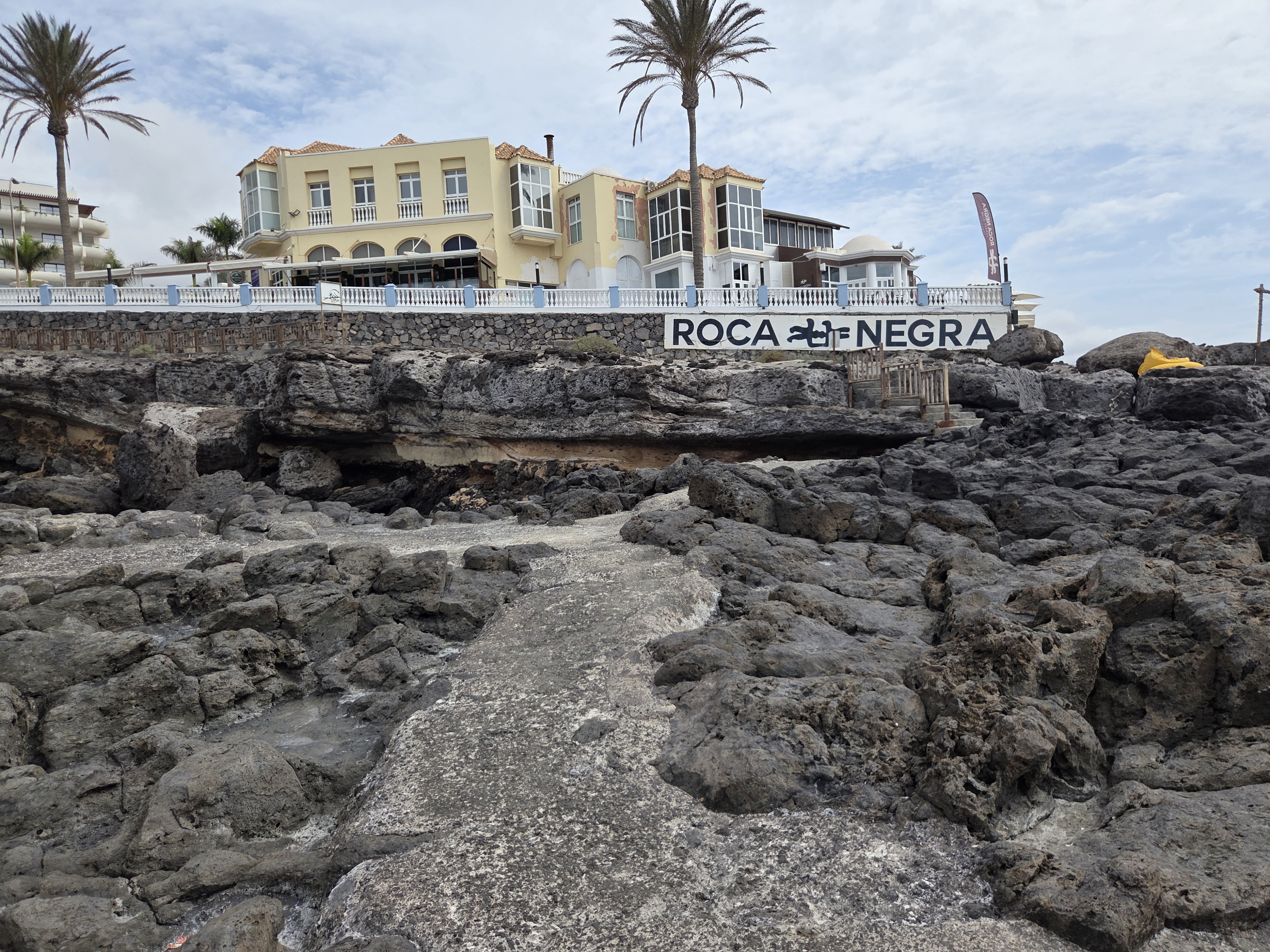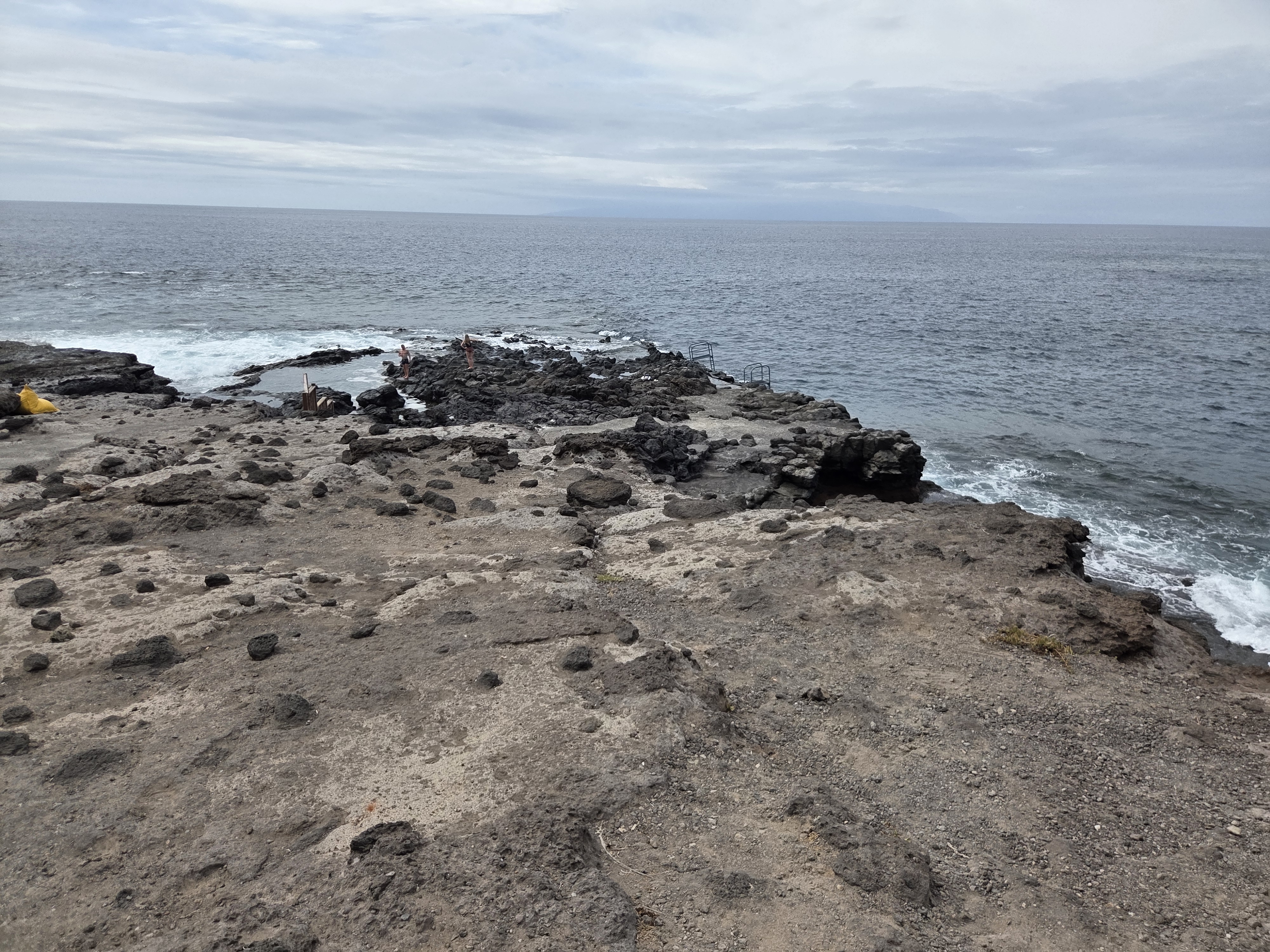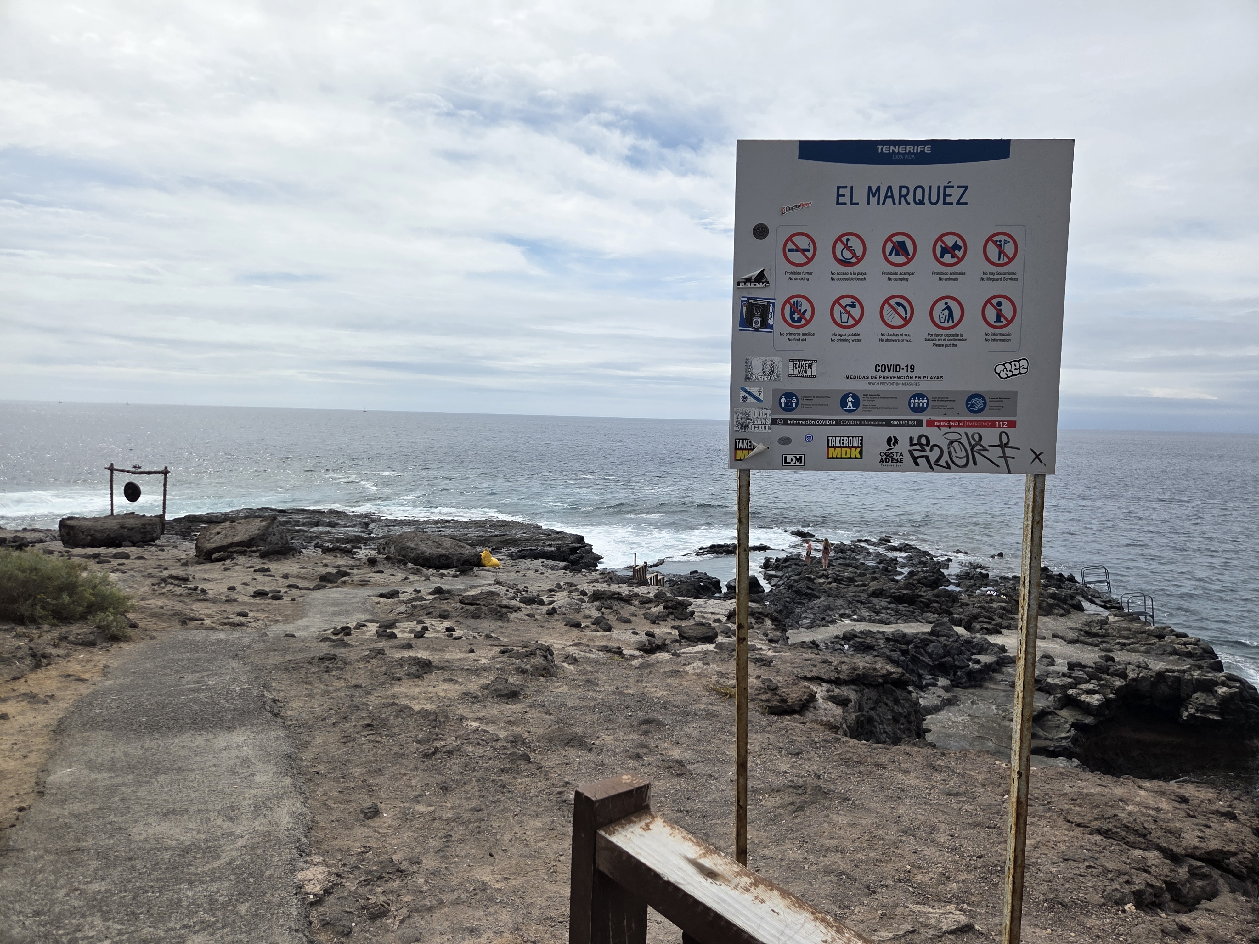 On the southwest coast of Tenerife, the El Marquéz area of Costa Adeje offers a raw volcanic shoreline shaped into natural tidal pools. It’s a favourite spot for sea swims on calm days, with metal ladders helping you enter and exit the Atlantic safely. Below you’ll find a photo guide showing the layout, access points and nearby landmarks such as Roca Negra.