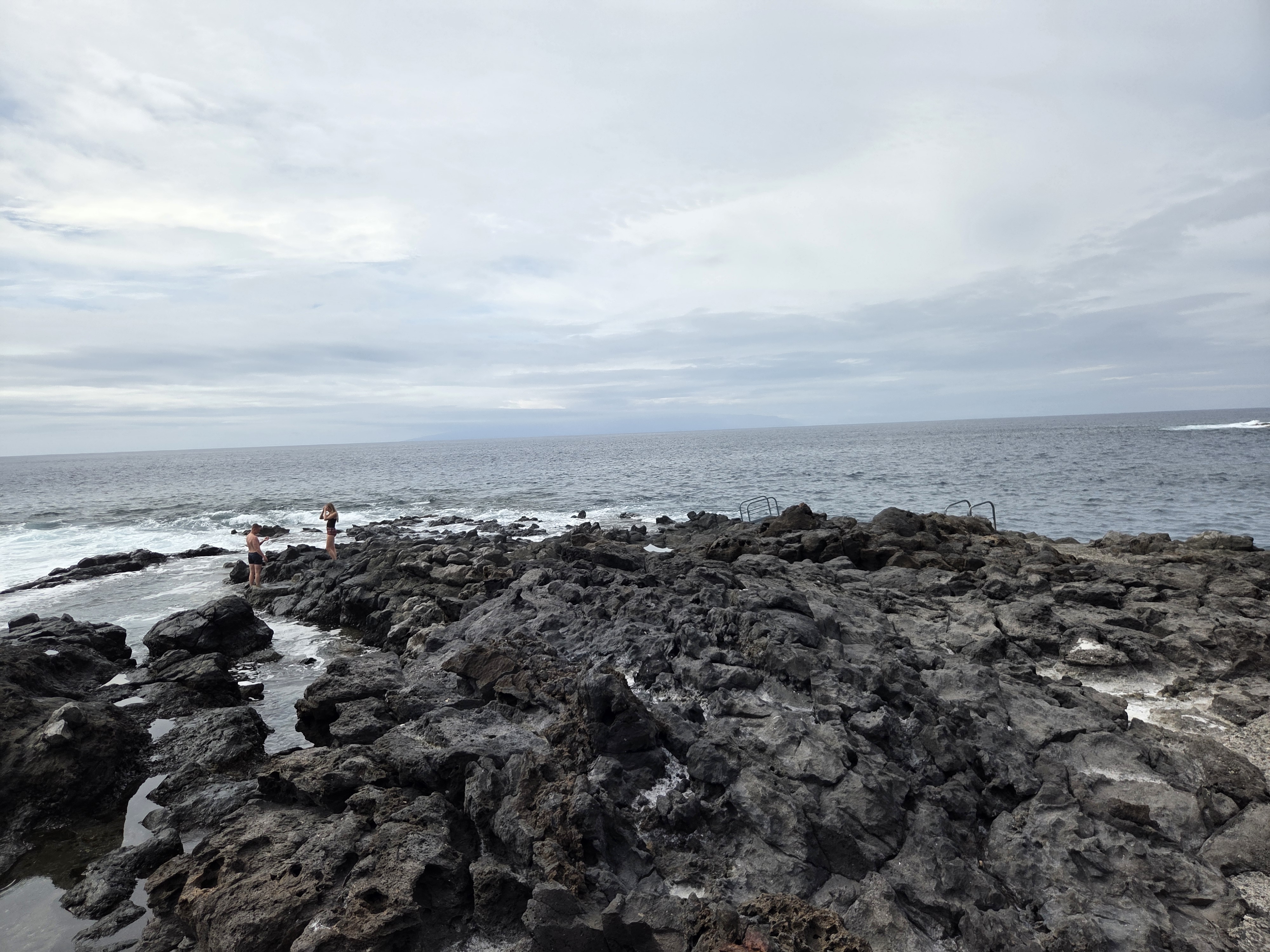 This overview shows the flat, petrified lava platforms that frame the shore. At mid and low tide, shallow basins form among the rocks, creating calm windows of water protected from the ocean swell.