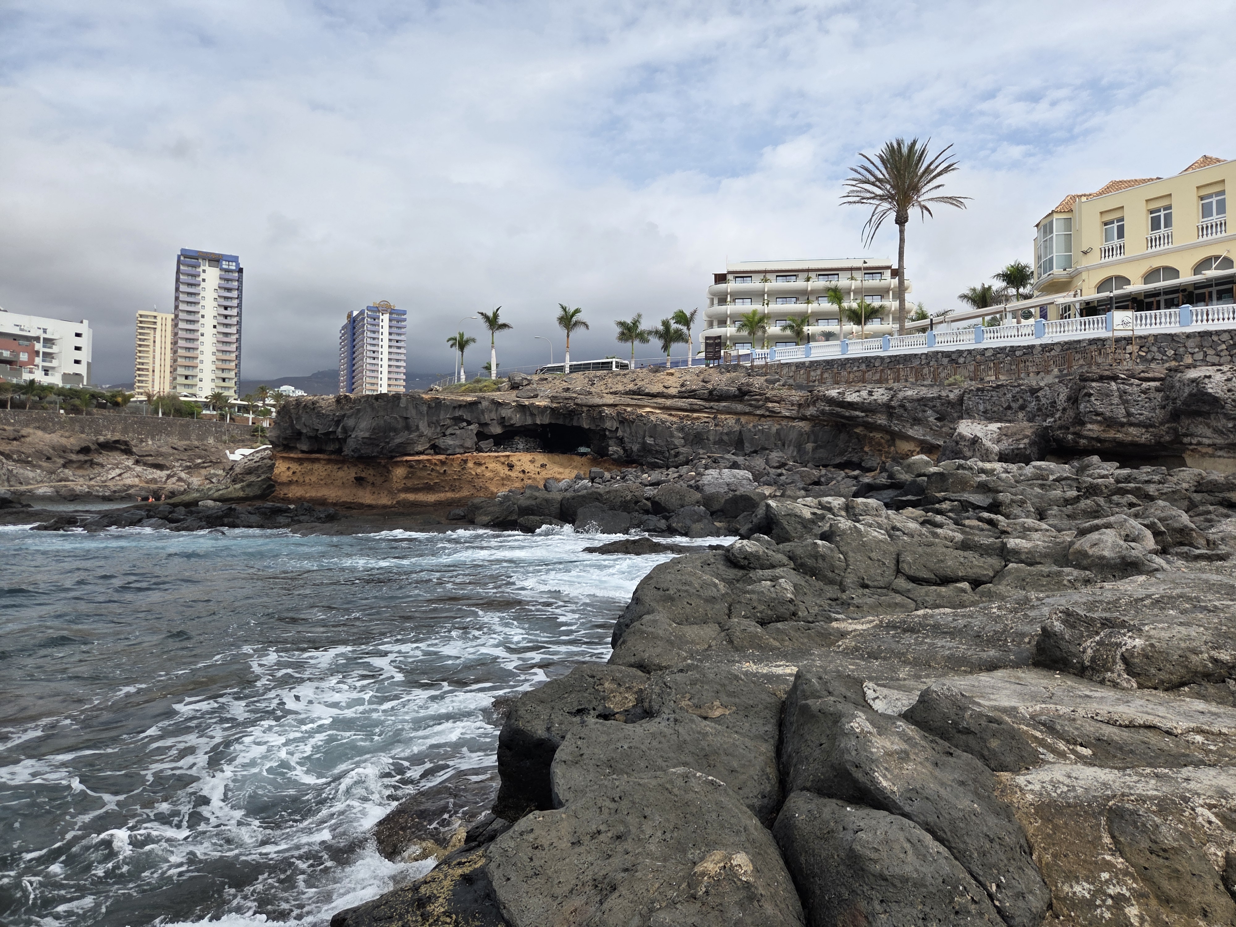 Looking back from the rocks you see Costa Adeje’s hotel zone and palm-lined promenades. Despite the urban setting, this corner keeps a wild, natural character compared with the big sandy beaches nearby.