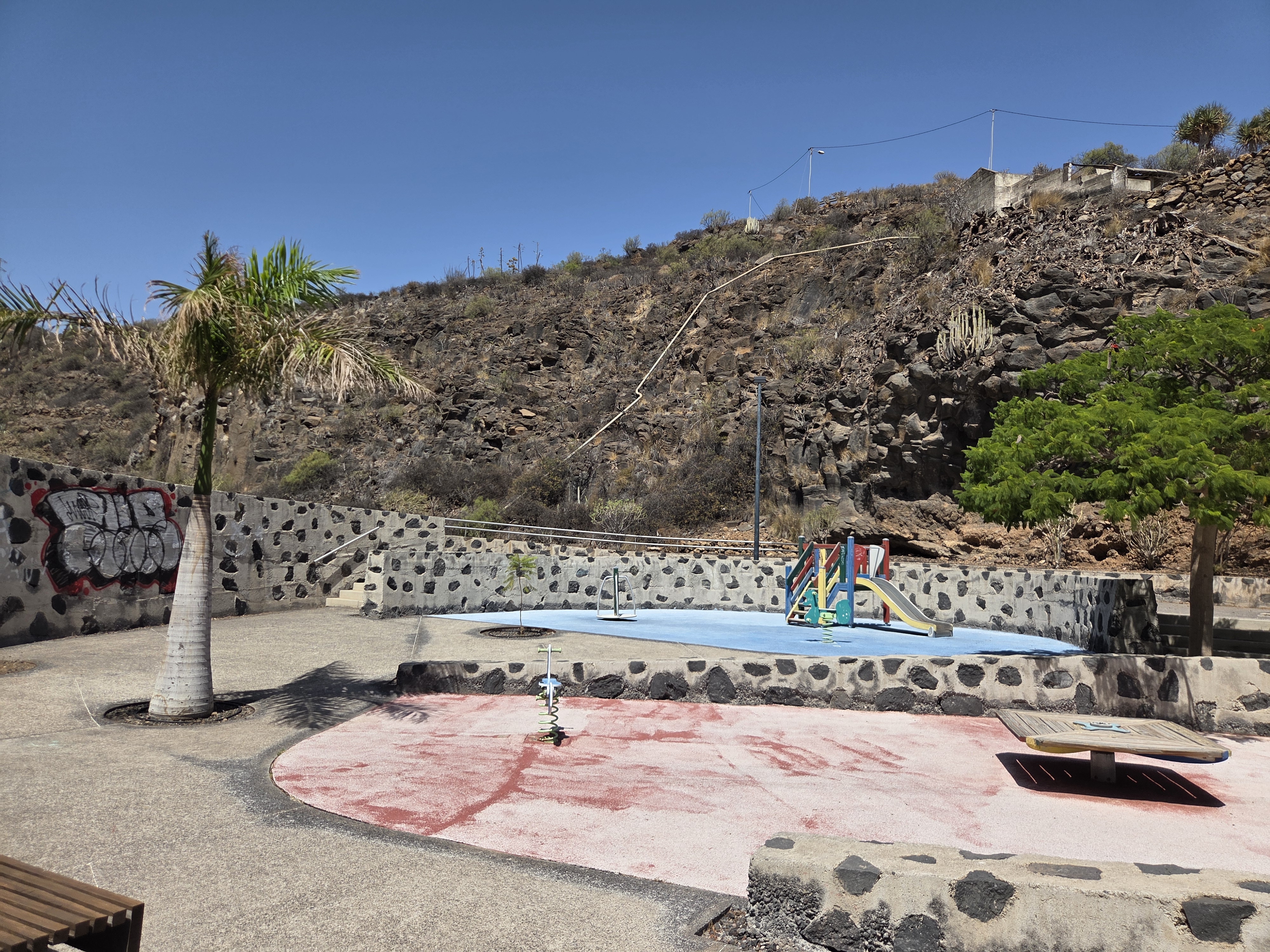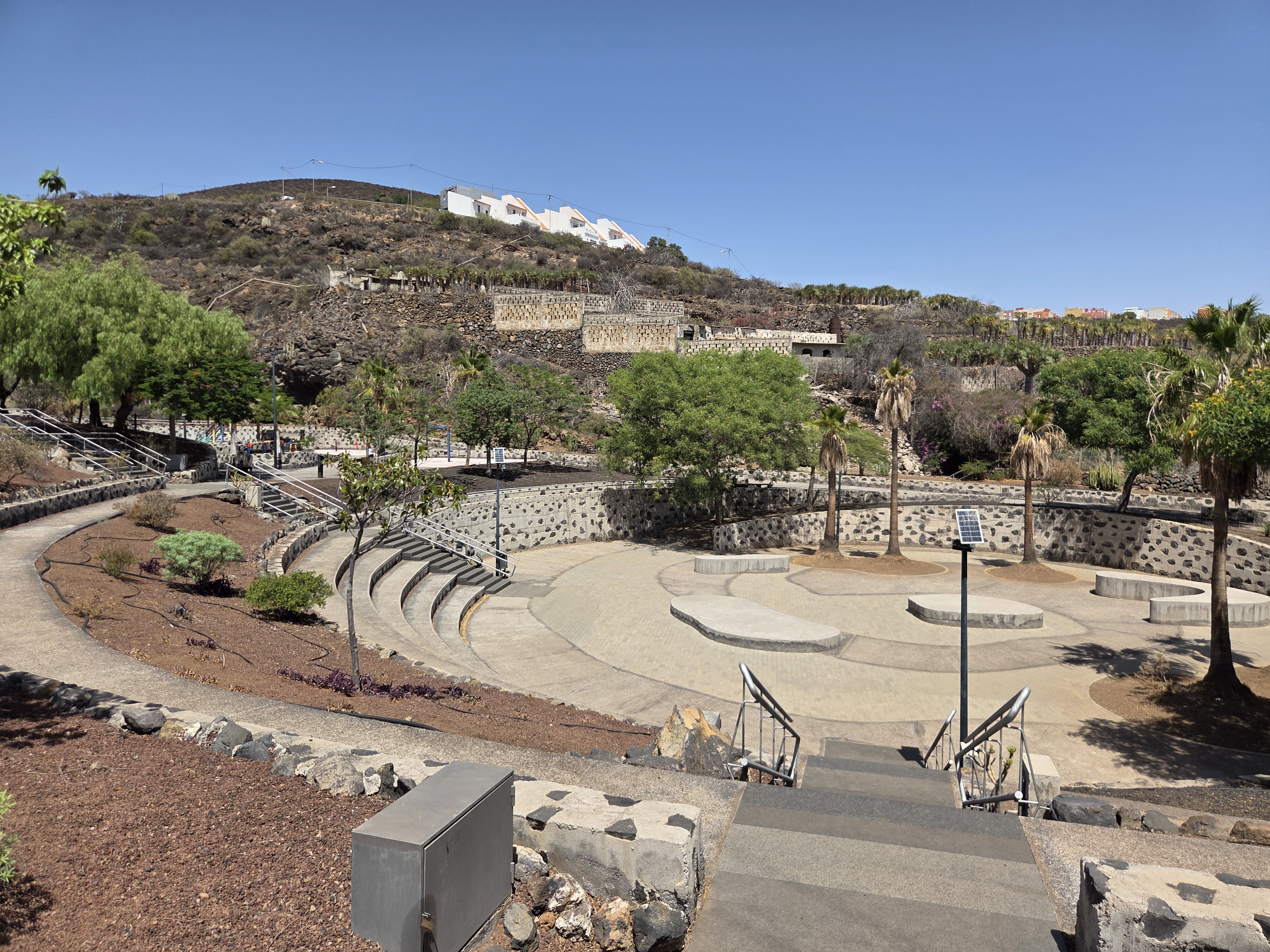 Parque Periurbano La Higuera is a thoughtfully landscaped public park in El Rosario, Tenerife. Built into a volcanic ravine, it combines terraced stonework, shade trees and accessible paths with spaces for community events, children’s play and outdoor fitness. The photos below walk you through the park’s main areas to help you plan a relaxed stop or a short stroll.