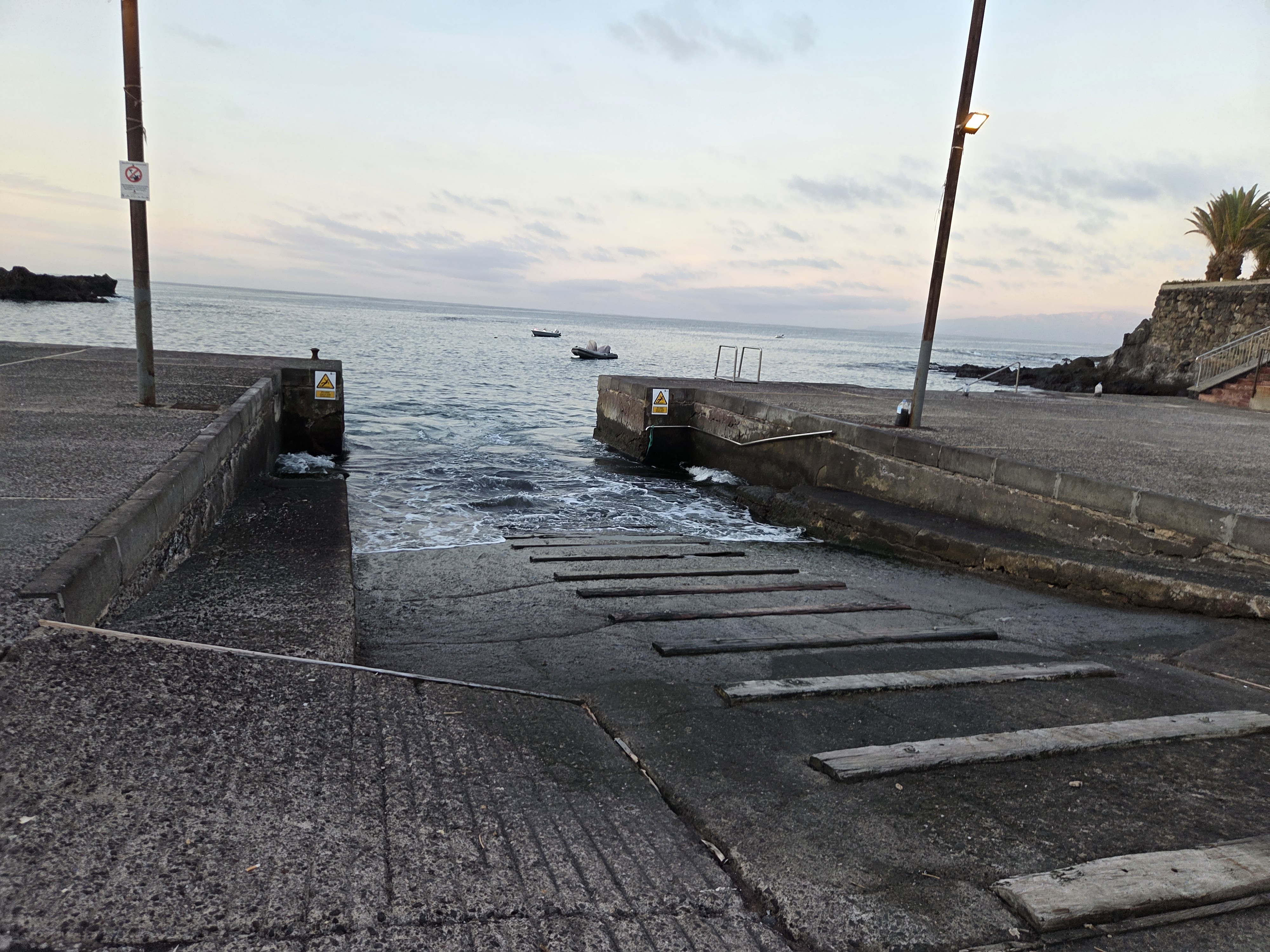 Behind the slip you’ll find a broad paved platform bordered by lava-stone walls—an authentic working corner that doubles as a quiet sunning spot between swims.