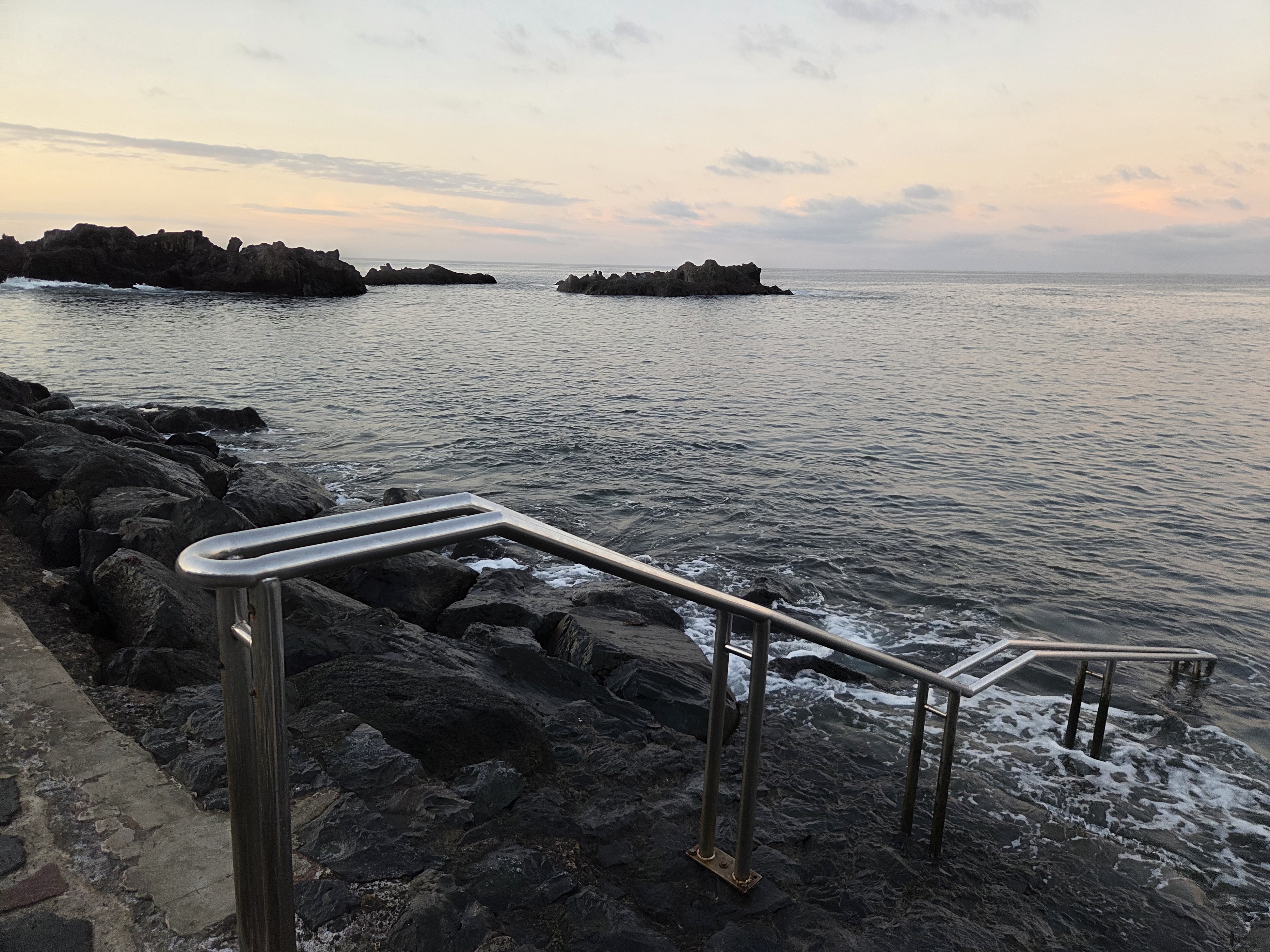 Sturdy handrails allow easy entry to the sea even when light swell pushes against the rocks—great for confident swimmers who prefer natural pools to sandy beaches.