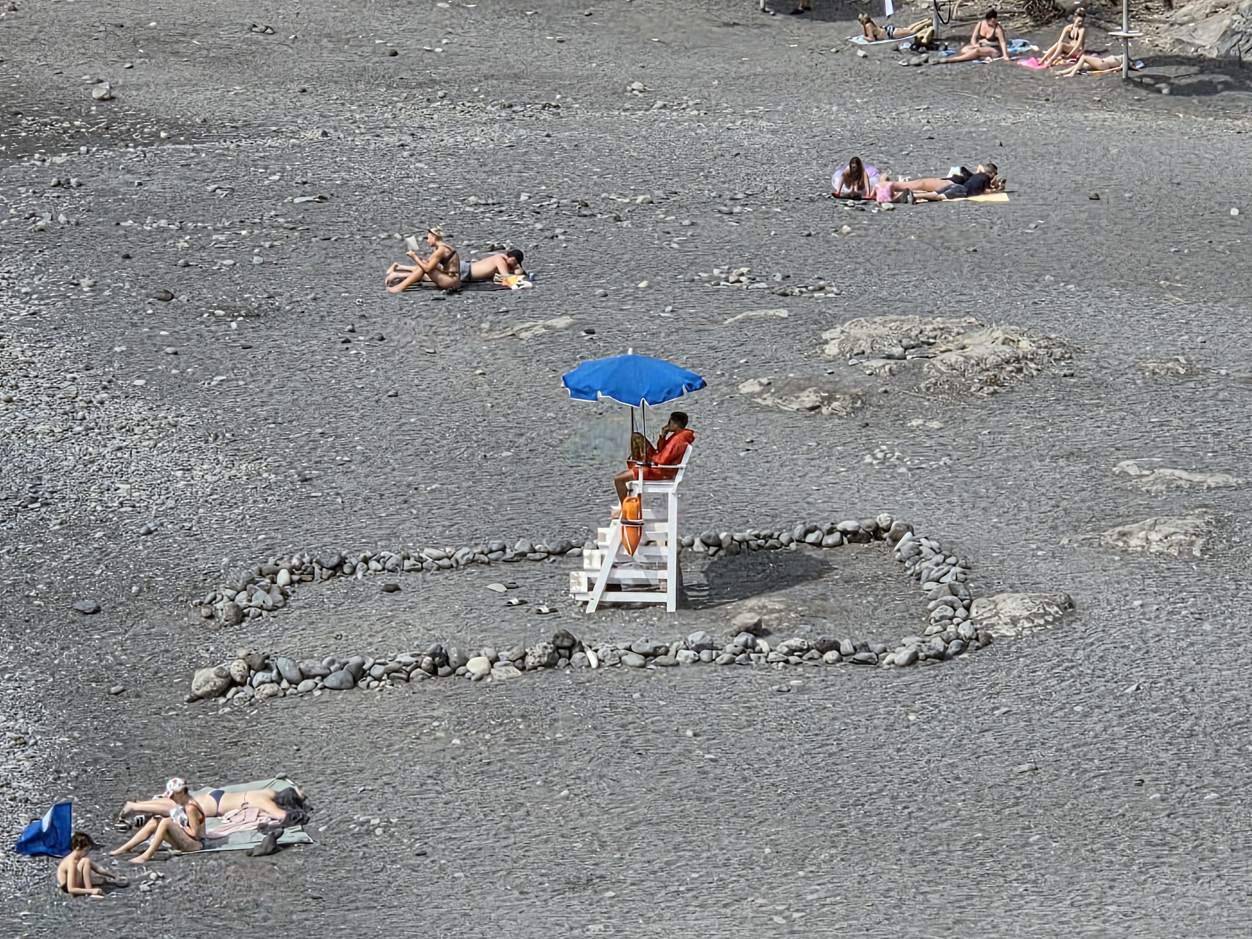 From the opposite cliff you can appreciate how the volcanic sands meet the turquoise Atlantic. The parasol lines and the gentle slope into the sea are clearly visible from above.