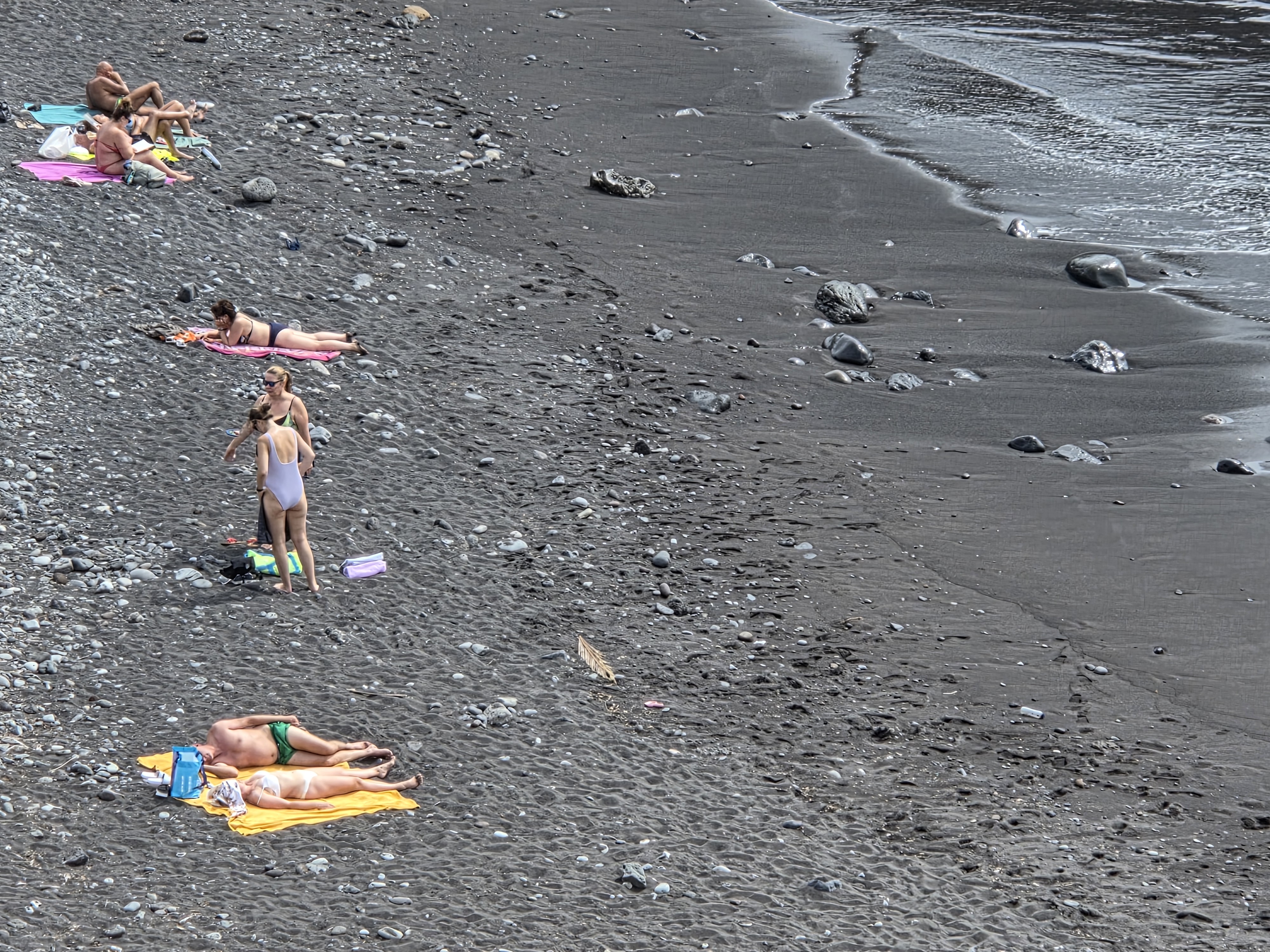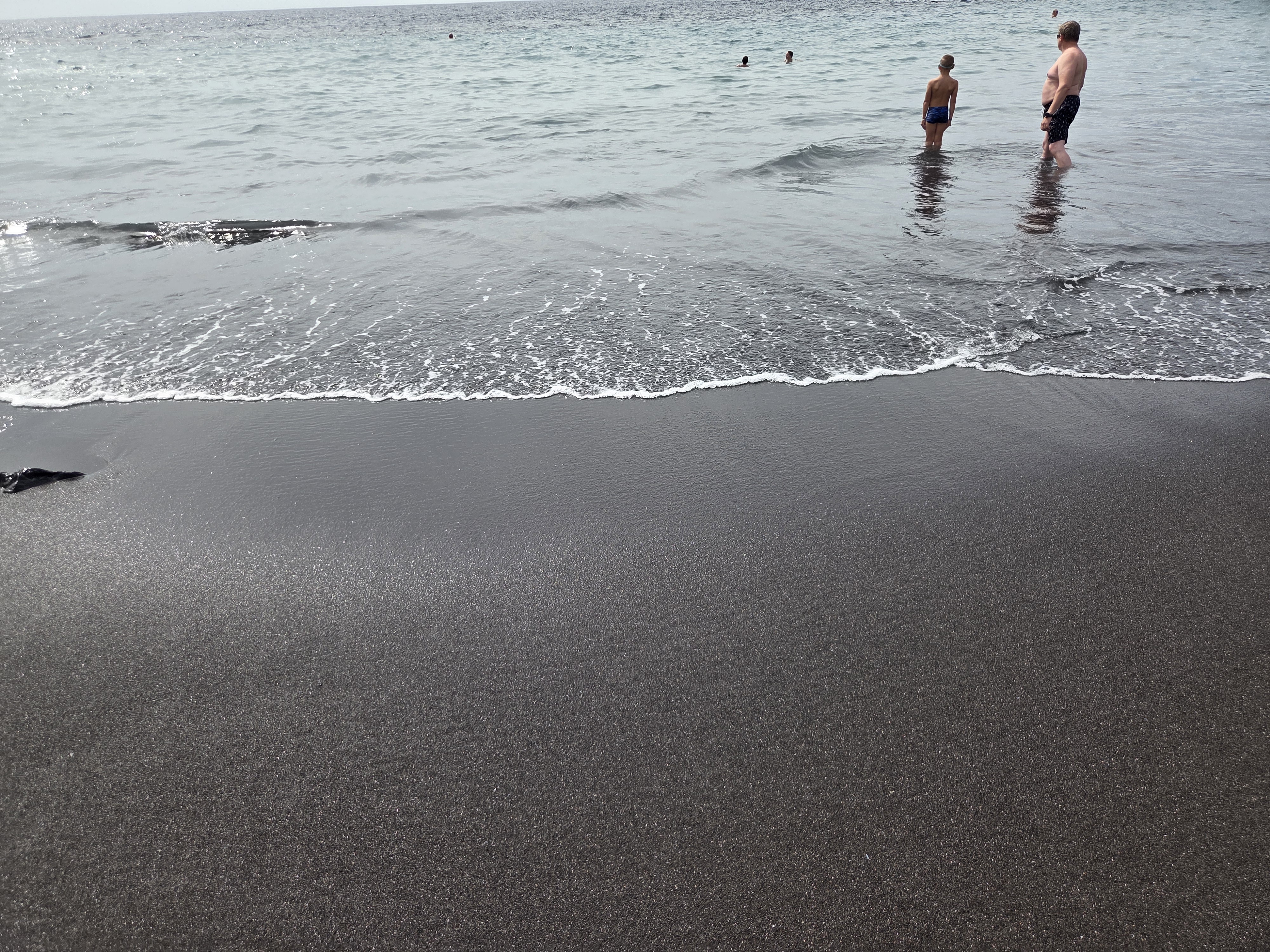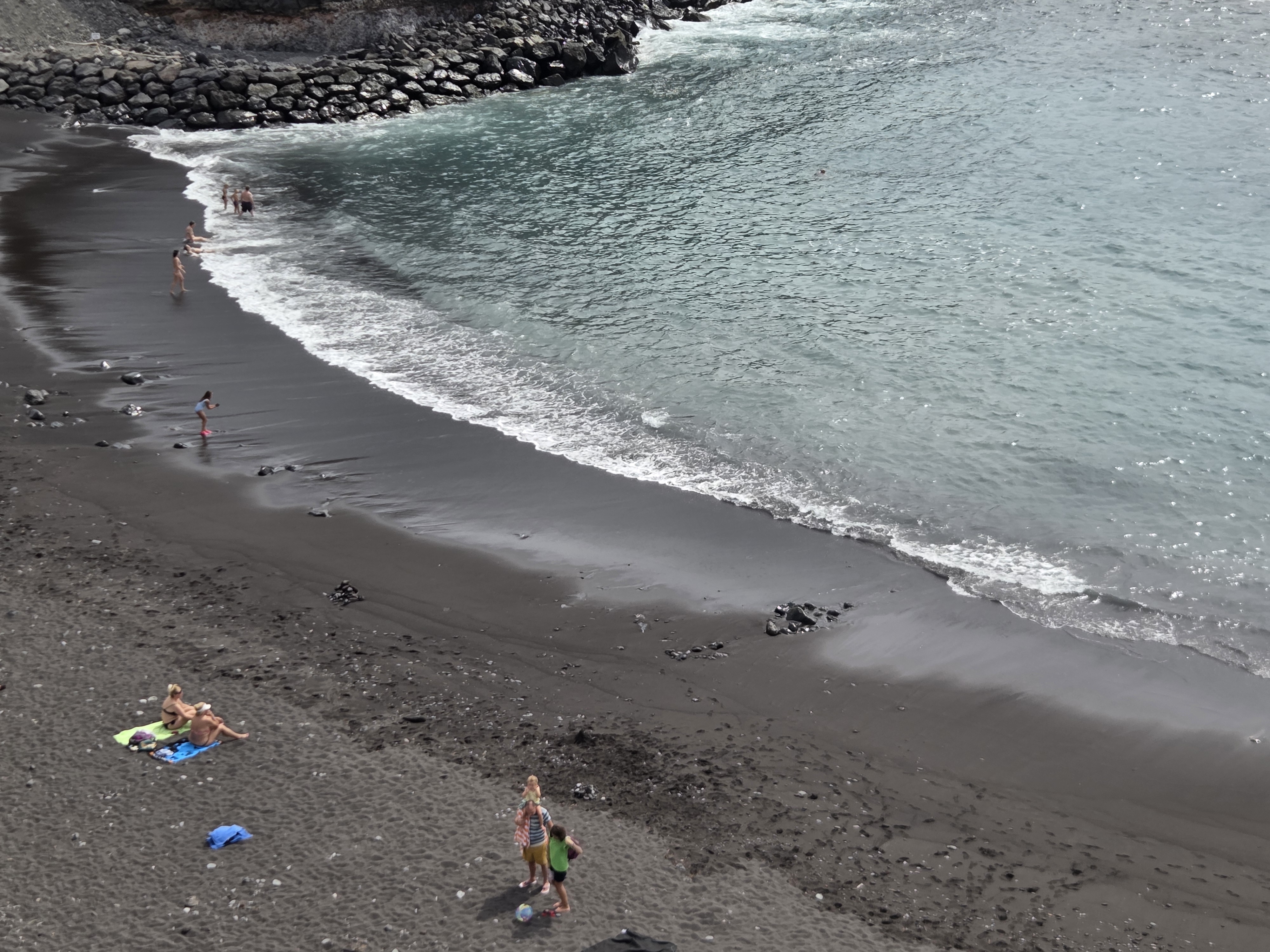 The beach surface mixes fine volcanic sand with rounded pebbles. Near the waterline the texture becomes smoother and compact, ideal for an easy walk into the sea.