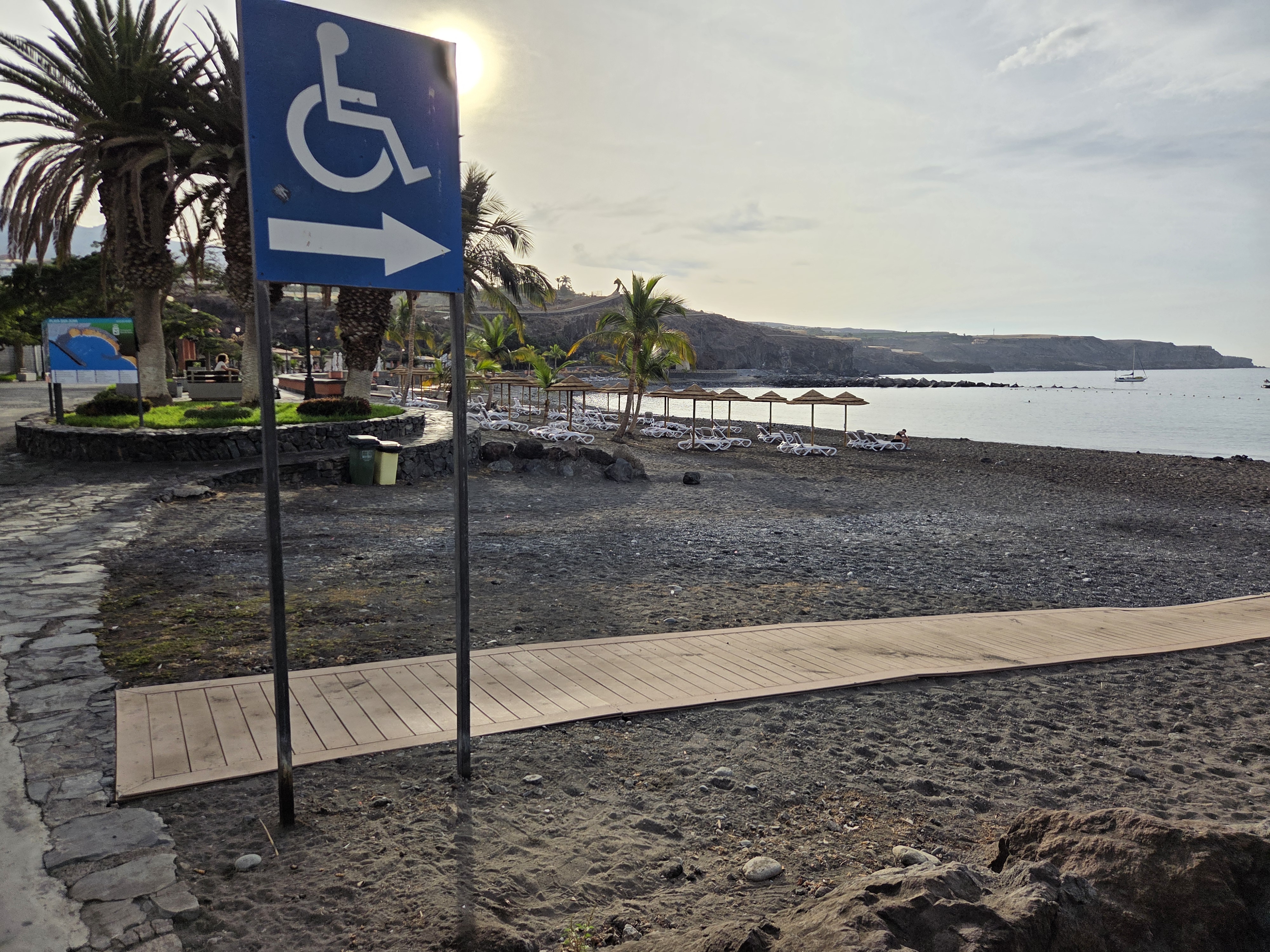 A continuous wooden boardwalk runs from the promenade across the sand. Clear wayfinding signage and the flat ramp make the beach easier to reach for wheelchair users, strollers, and anyone who prefers firm footing on the volcanic sand.