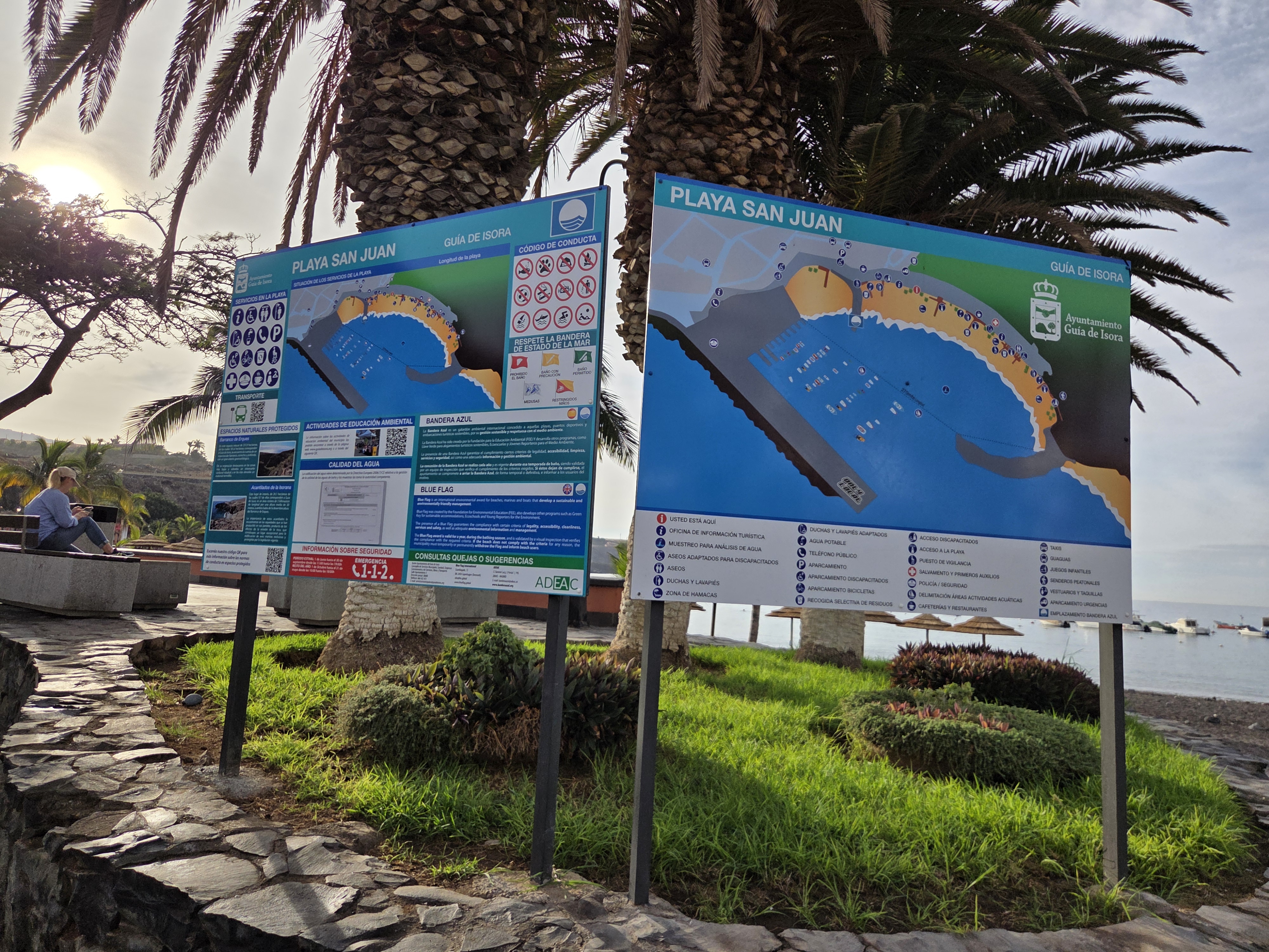 Large boards near the palms display a beach map, safety rules, and practical details. They’re handy for locating services such as access points, lifeguard stations (seasonal), and bathing areas.